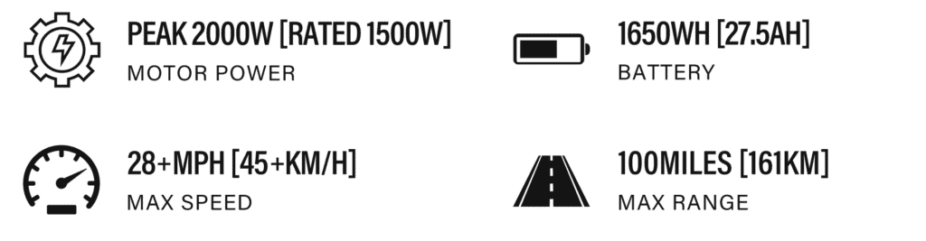 Motor: 1500W brushless motor Battery:48V/16Ah Removable Battery Top Speed:40.3 mph(64.9km/h) Range:60 Miles(96.6km) Charge Time:7-8h Torque: 110Nm Climb:up to 30° slopes Brakes:Dual hydraulic disc brakes Suspension: Dual Shock Absorption Tires: 20″ × 4.0″ fat tire Gearing: Shimano 7-speed Frame: Aluminum alloy Dimensions: 1800 × 600 × 1150 mm Weight: 38.3kg/84.4lbs Max Load: 150kg/330lbs